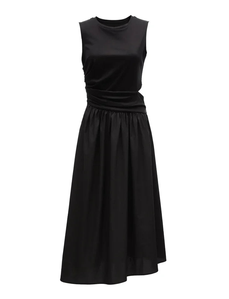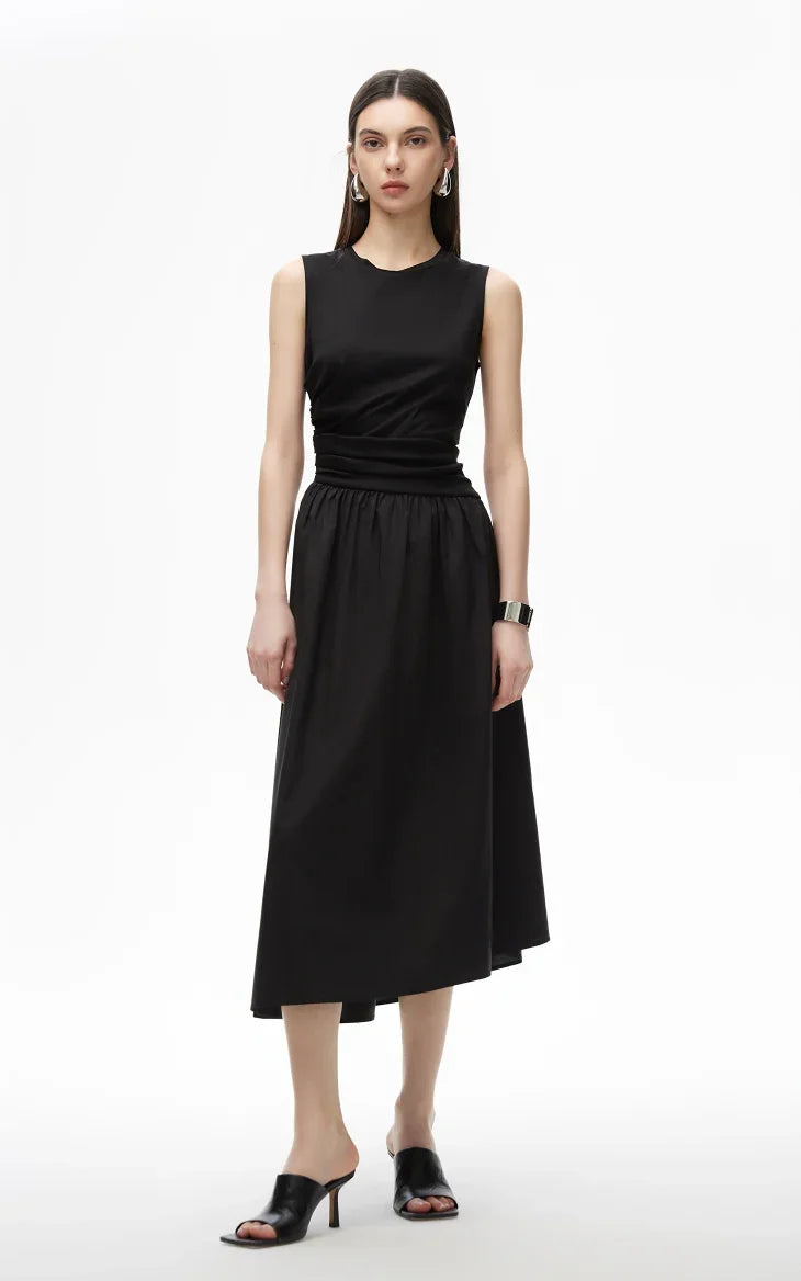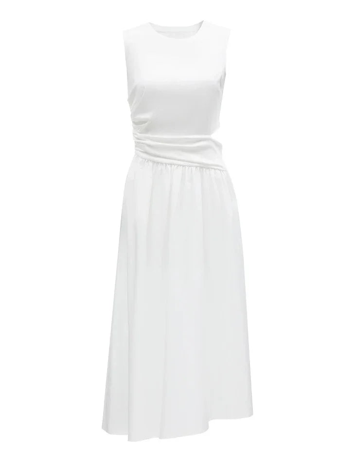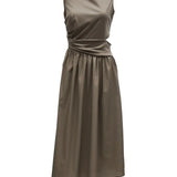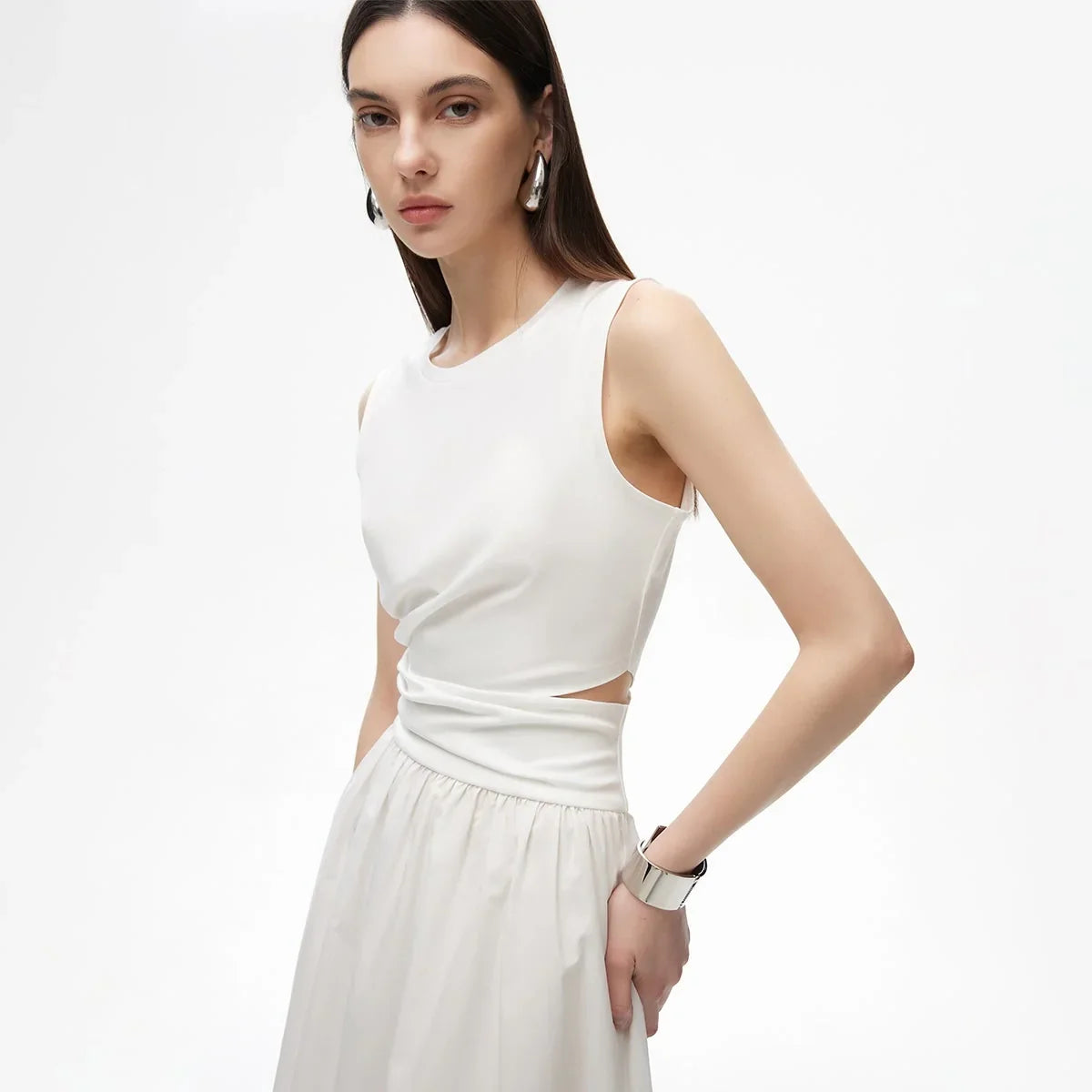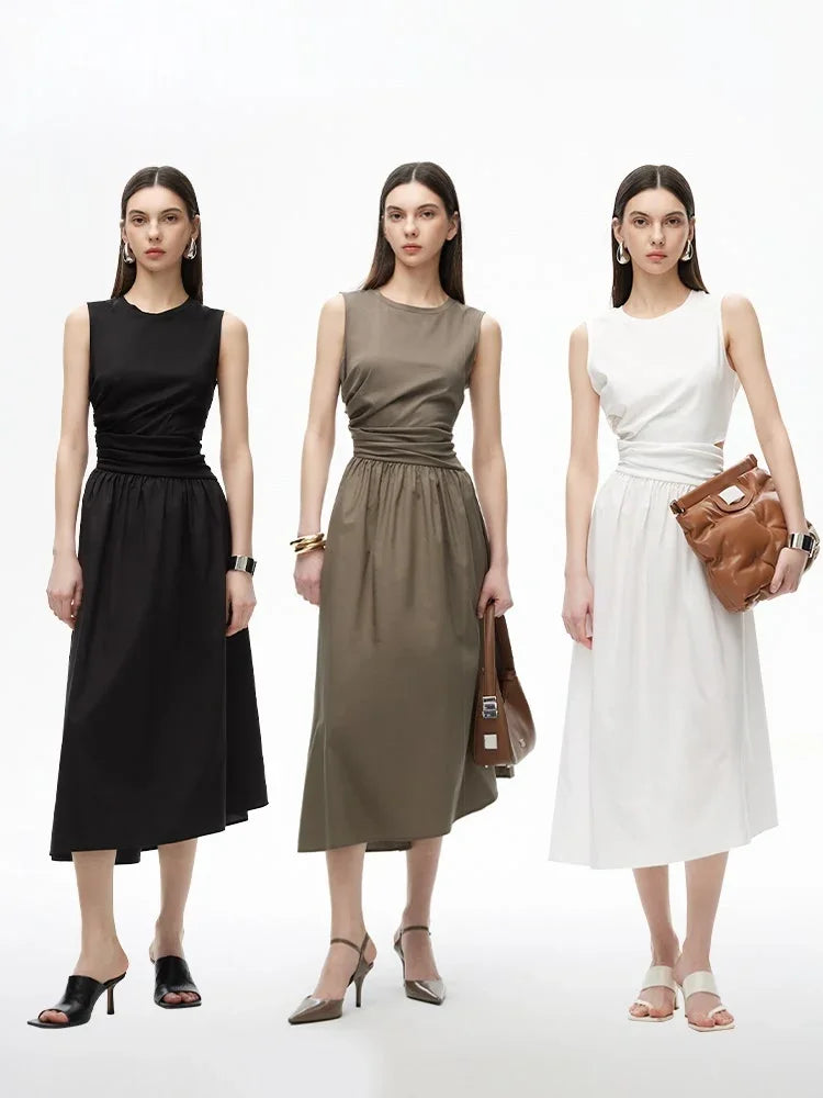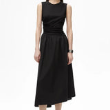 This dress features an elegant umbrella skirt that adds volume and flow, while the asymmetrical cutout waist creates a bold, modern look. The invisible side zipper ensures a seamless and smooth finish to the design.