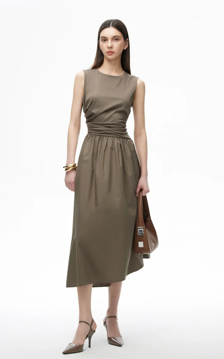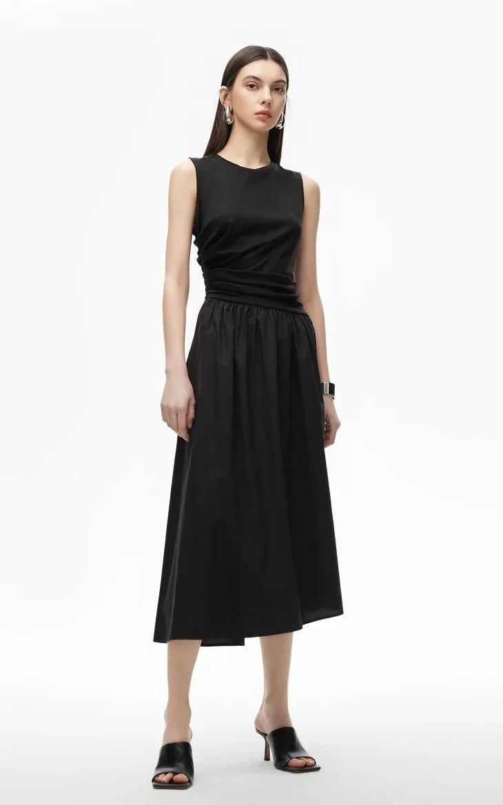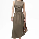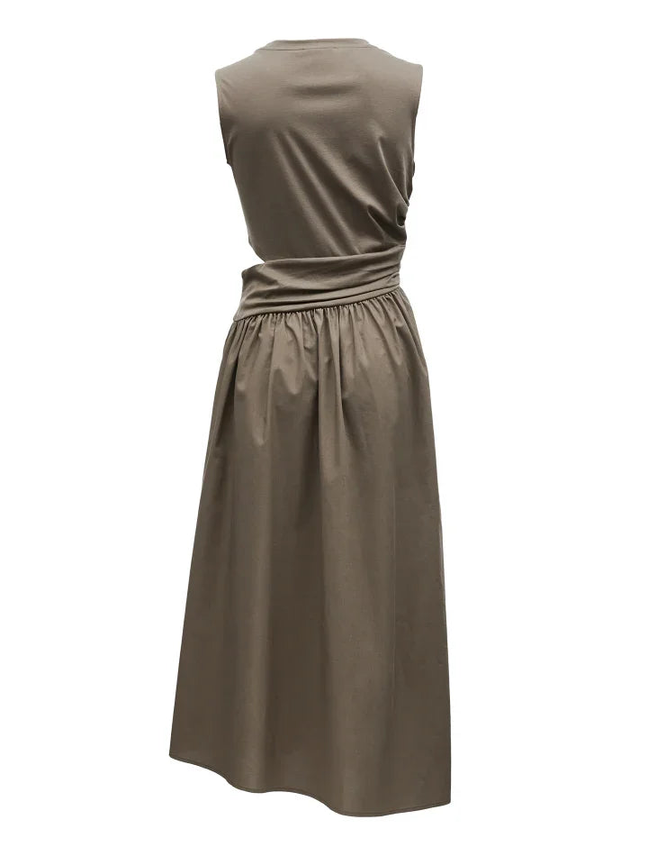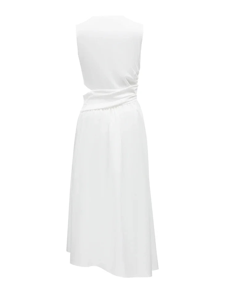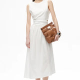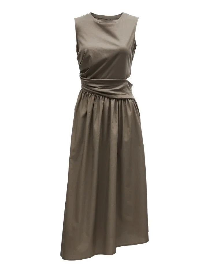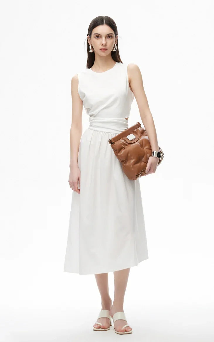 This dress features an elegant umbrella skirt that adds volume and flow, while the asymmetrical cutout waist creates a bold, modern look. The invisible side zipper ensures a seamless and smooth finish to the design.