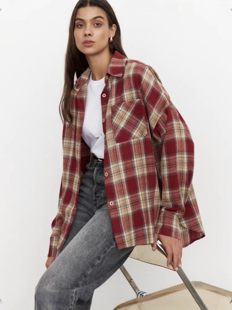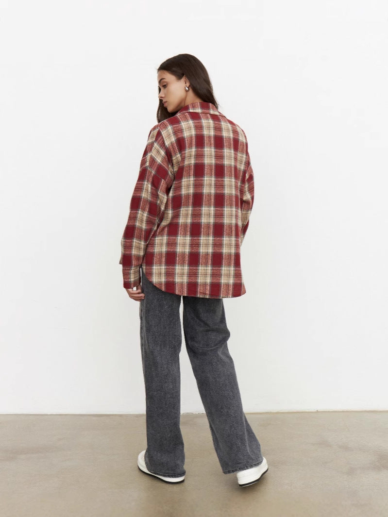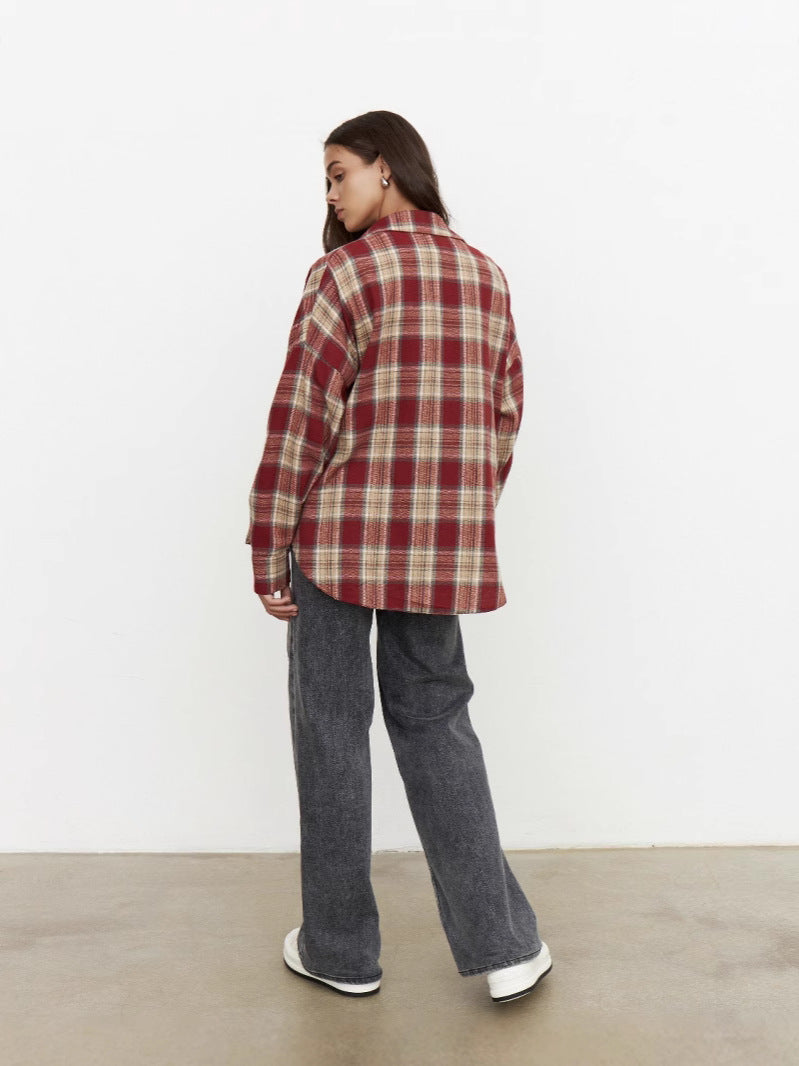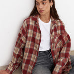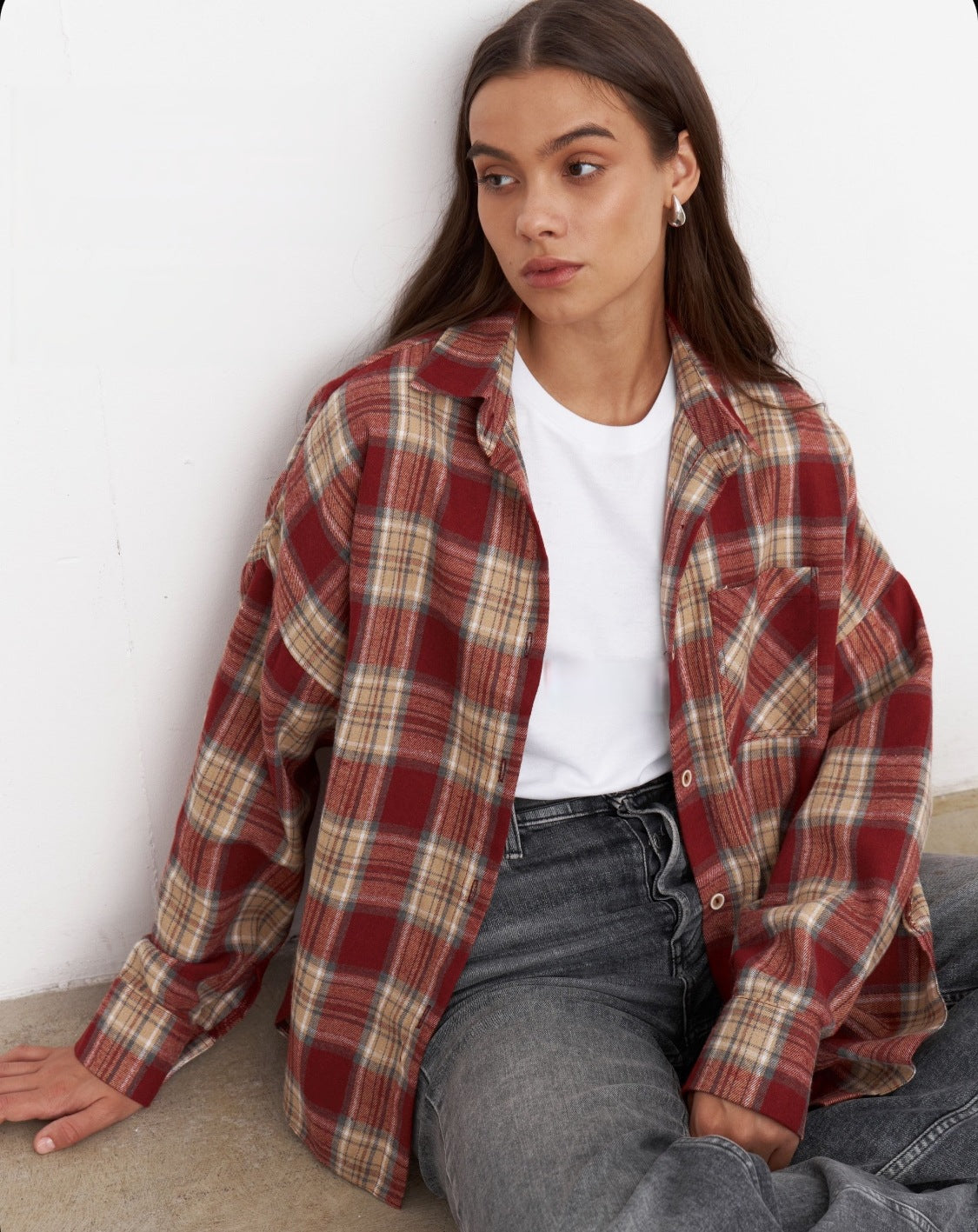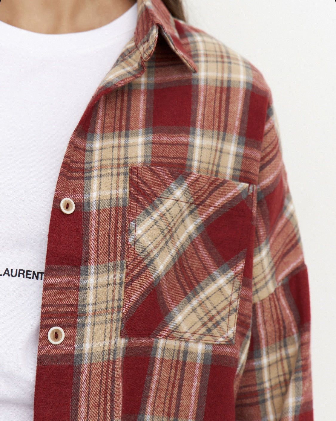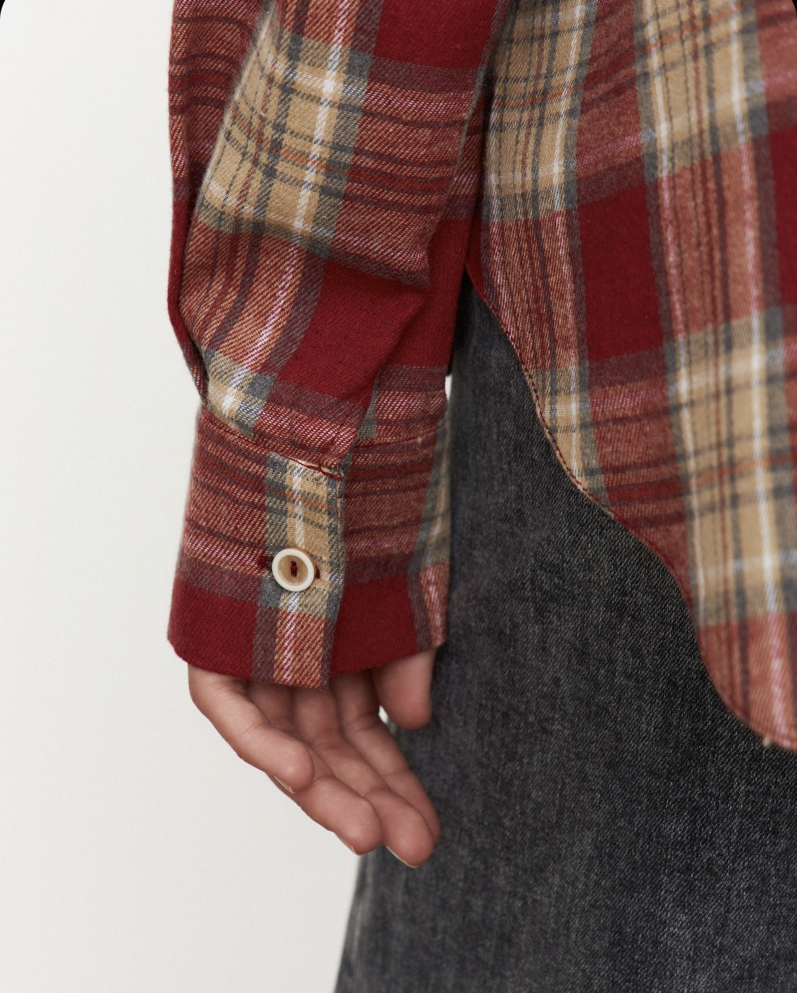 Crafted from soft, breathable fabric, this relaxed-fit shirt features a rich rust red plaid pattern accented with warm beige and muted grey tones. The classic button-front design is complemented by a single chest pocket and a gently curved hem, offering an effortless yet refined look. The fabric’s subtle texture enhances its visual depth, making it both comfortable and visually appealing. Its timeless check pattern and high-quality finish ensure it remains a versatile, enduring piece in any wardrobe.