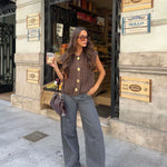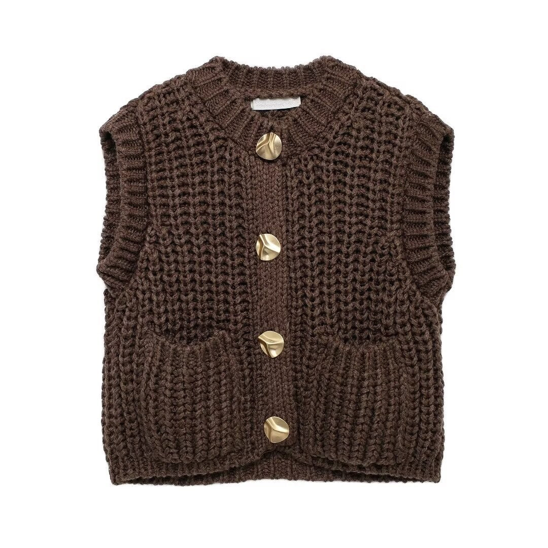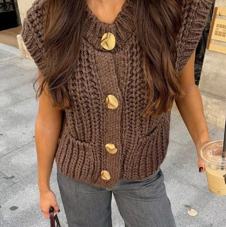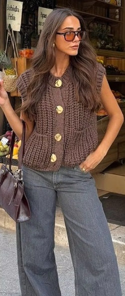 This cozy sleeveless cardigan is crafted from a thick, chunky knit fabric, offering warmth and comfort in a stylish design. Featuring a classic high neckline and a button-down front with elegant gold-tone buttons, it combines practicality with sophistication. The cardigan includes two front pockets, adding functionality and a casual charm. Its deep burgundy color makes it versatile for pairing with various outfits, from casual jeans to dresses. Perfect for layering during cooler seasons, this piece is an essential addition to any wardrobe, blending timeless style with modern appeal.