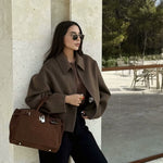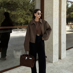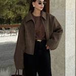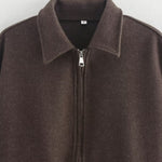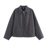 Elevate your outerwear collection with this chic minimalist coat crafted in a textured tweed fabric. Its structured silhouette and oversized sleeves lend a bold, fashion-forward presence, while the zip-up front and classic spread collar offer timeless practicality. The solid tone exudes understated elegance, making it easy to pair with casual or refined looks. Available in a variety of versatile colors, this coat is ideal for transitional seasons, offering both warmth and style for the modern woman on the move.