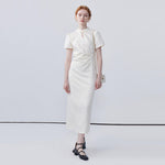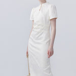 This dress features a fashionable stand collar that adds a modern and refined touch. The pinch pleat design enhances the silhouette, creating a fuller and more structured look for an elegant and stylish appearance.