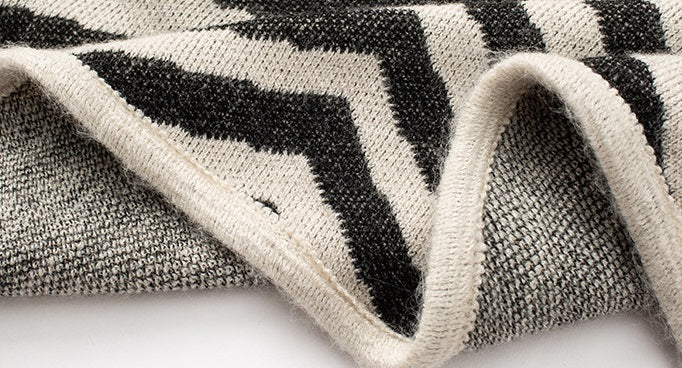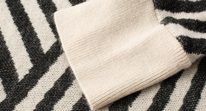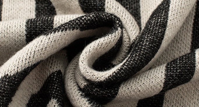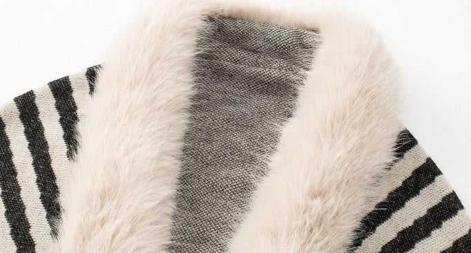 Crafted with a luxurious blend of bold geometry and plush detailing, this piece offers both structure and softness. The sharply defined stripes create a modern visual rhythm, while the faux fur trim introduces a rich, tactile contrast. Finished with a fringed hem for added texture and movement, it’s an elevated take on a cold-weather essential. The relaxed silhouette allows ease of wear without compromising on elegance or presence.