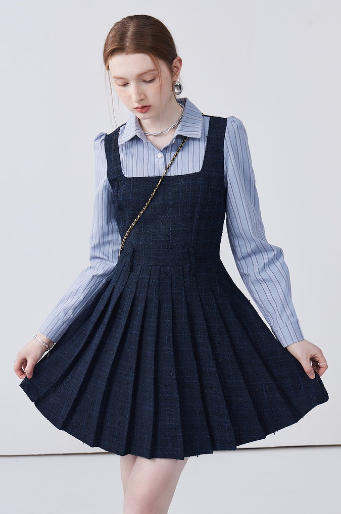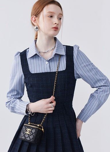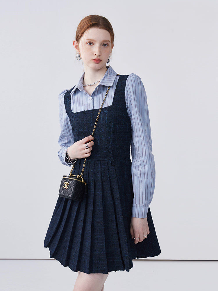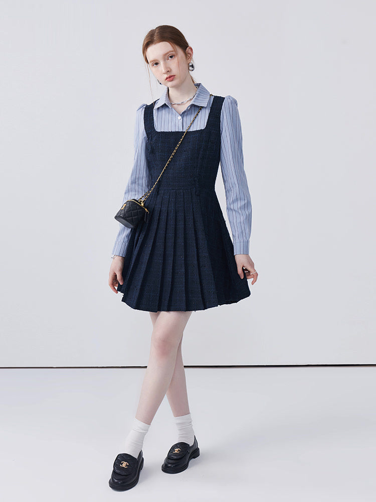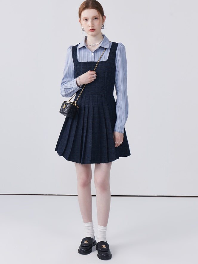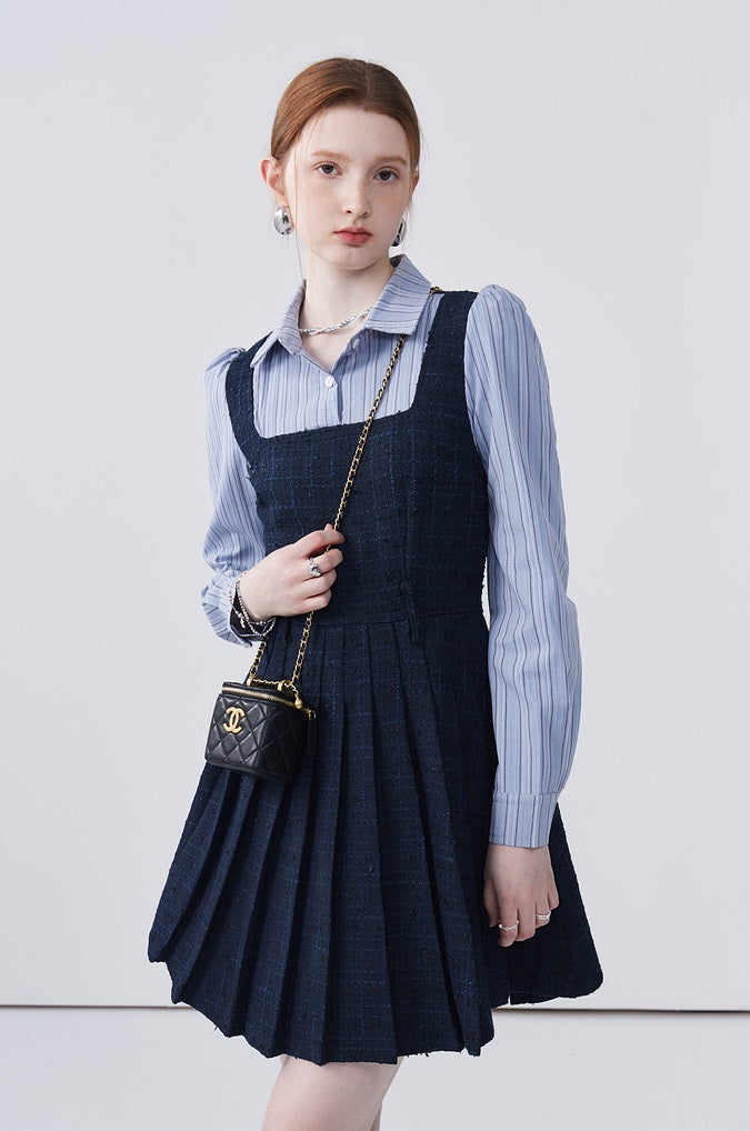 This dress features a spliced lapel design that beautifully modifies the face shape, adding a touch of elegance. Delicately pleated with exquisite workmanship, it creates a refined look that's both stylish and flattering. Perfect for adding sophistication to any ensemble.