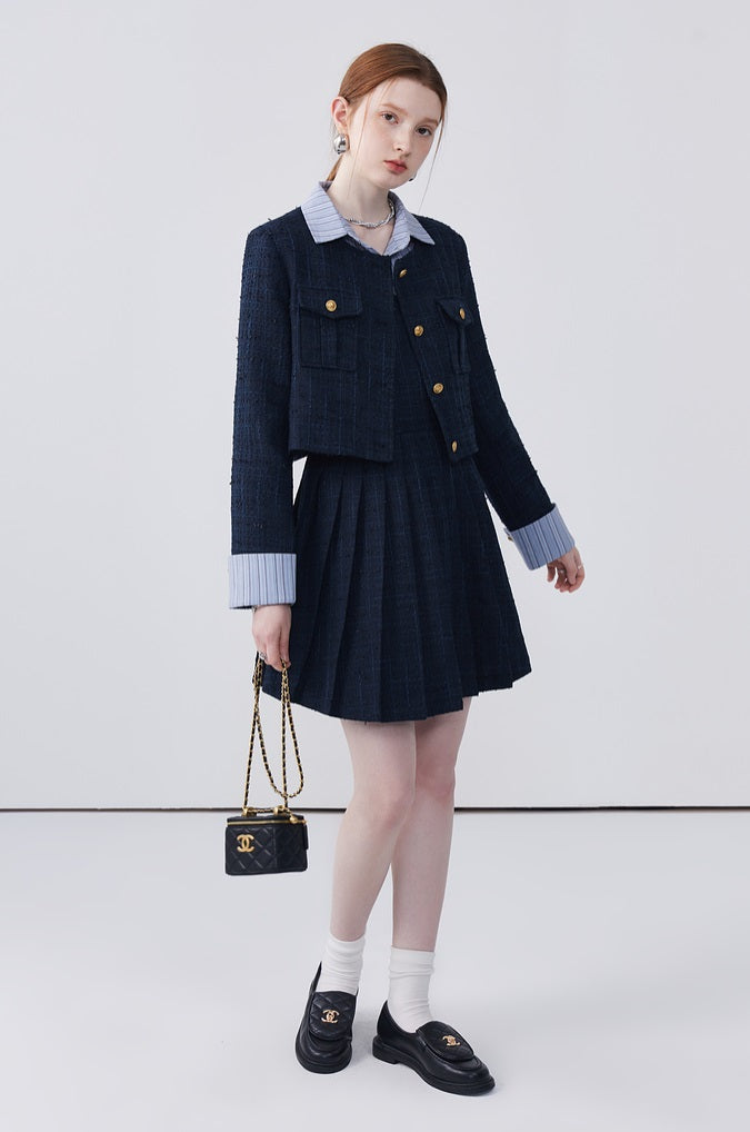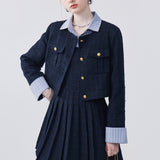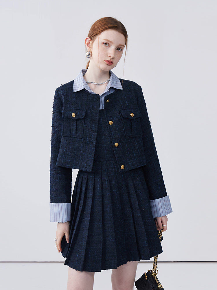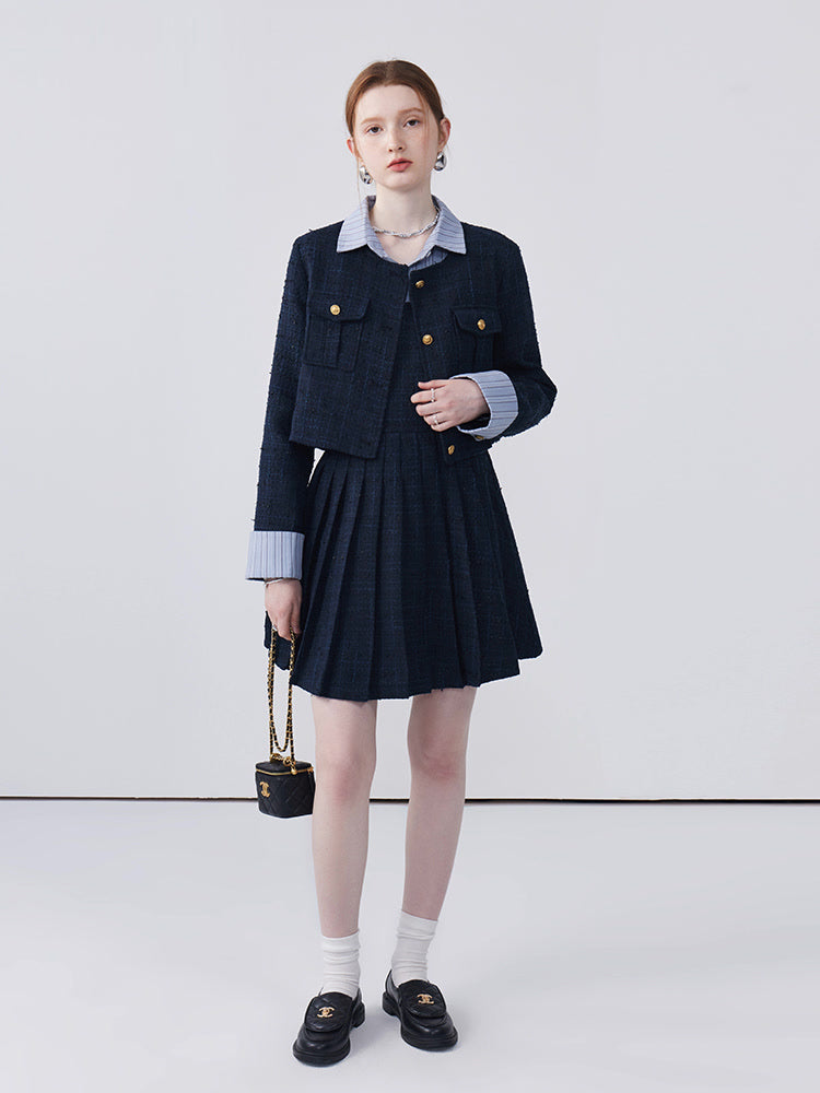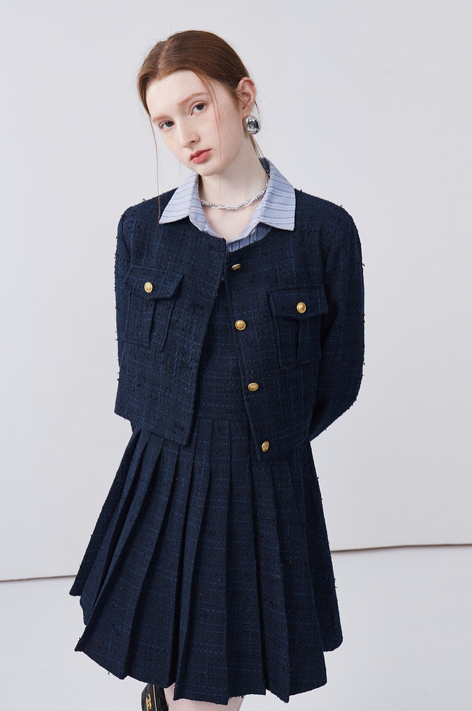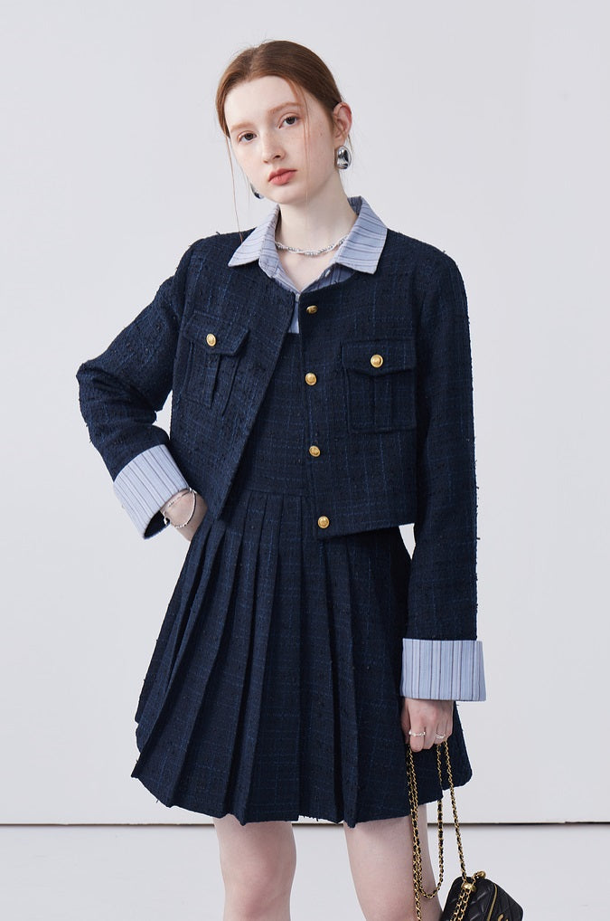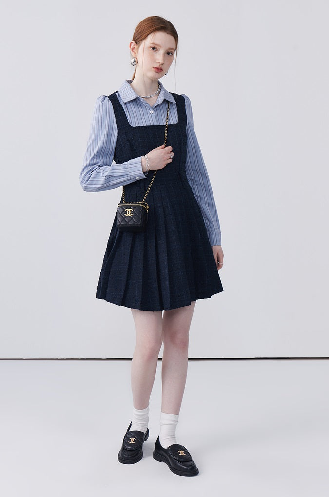This dress features a spliced lapel design that beautifully modifies the face shape, adding a touch of elegance. Delicately pleated with exquisite workmanship, it creates a refined look that's both stylish and flattering. Perfect for adding sophistication to any ensemble.