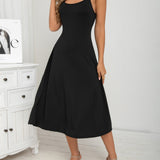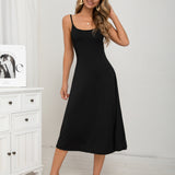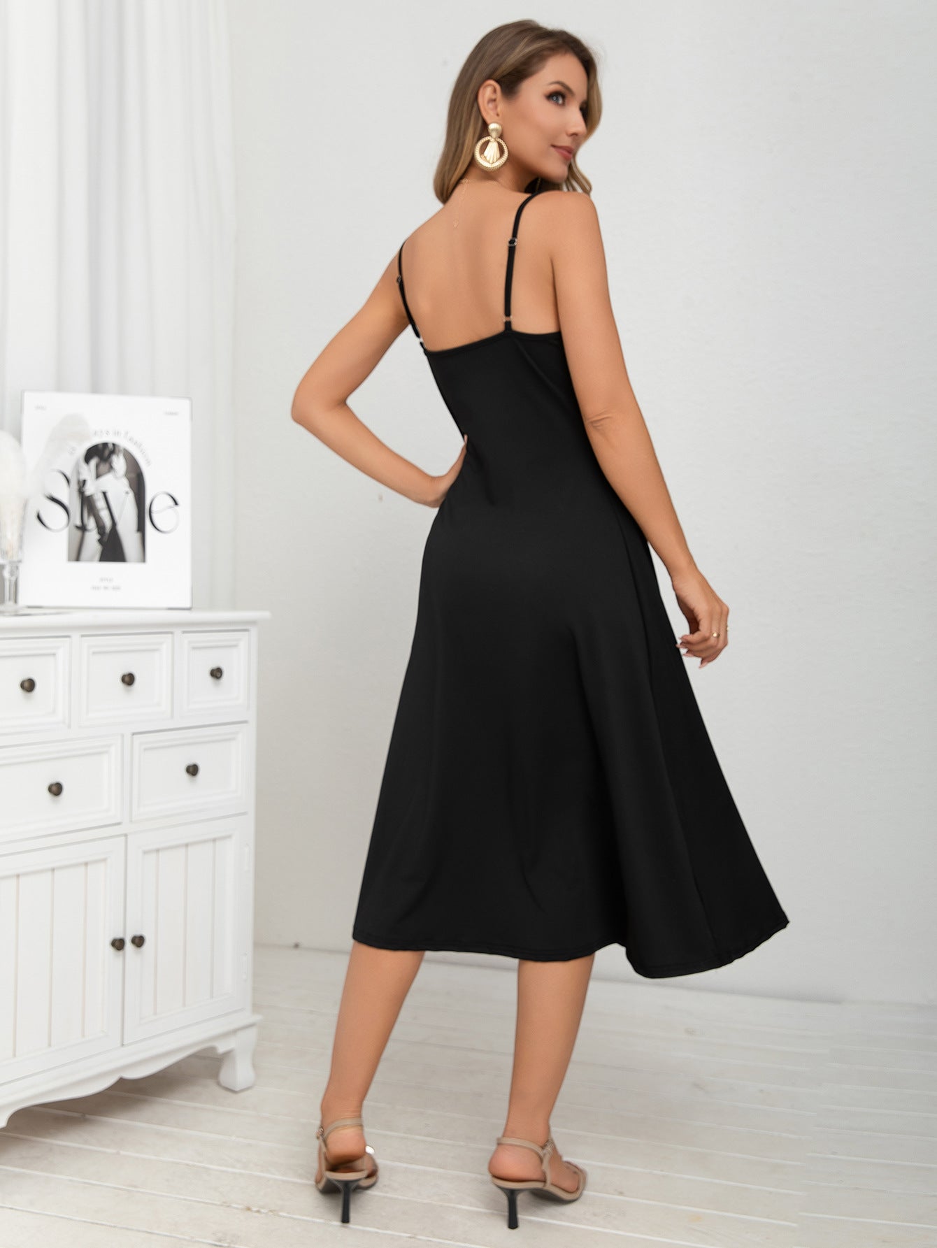 This black suspender dress features a simple yet elegant design, offering a sophisticated and versatile look that can easily be dressed up for any occasion.