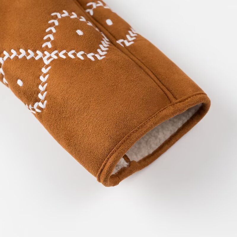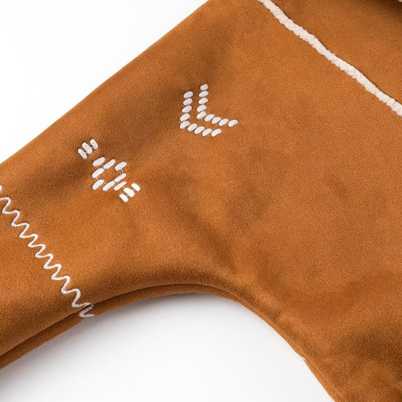 Infused with cozy elegance, this printed jacket is a celebration of seasonal style. Featuring intricate embroidered motifs and a plush lapel collar, it brings warmth and charm to any winter outfit. The soft fleece lining contrasts beautifully with the structured suede-like outer, delivering both comfort and sophistication. Oversized yet tailored, this piece effortlessly balances relaxed fit with high-end aesthetics. Whether worn over casual ensembles or elevated with accessories, it's a standout staple for the modern wardrobe.