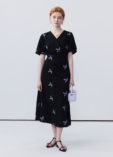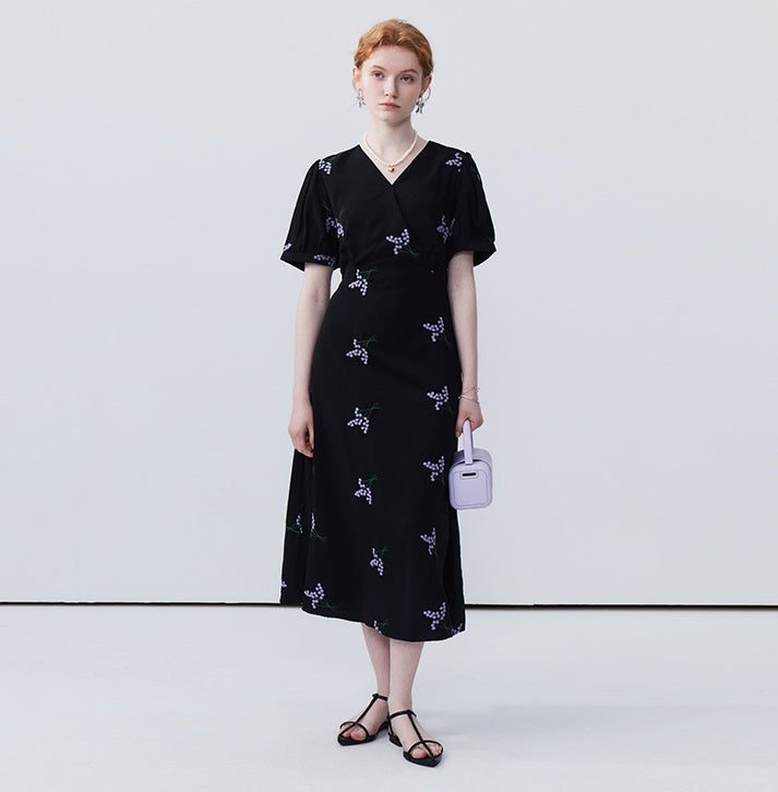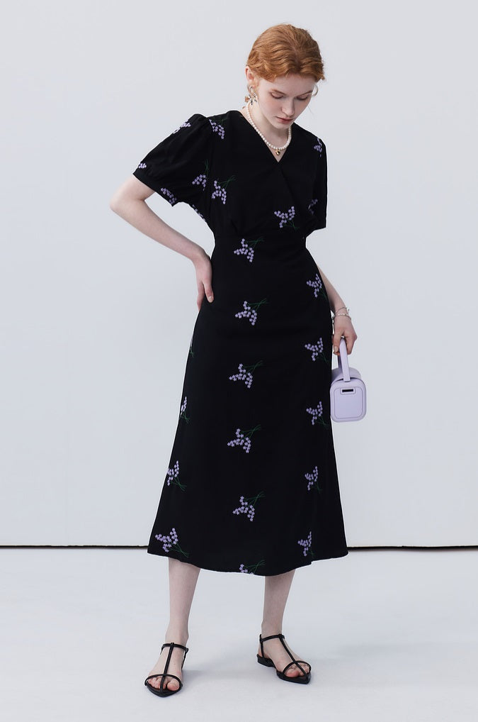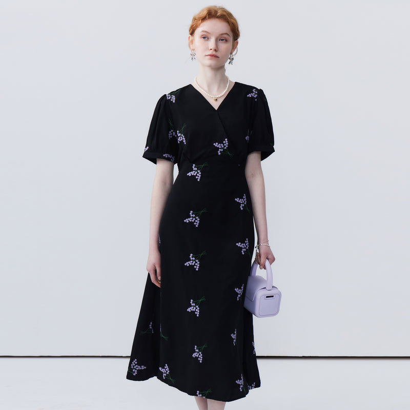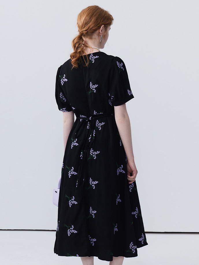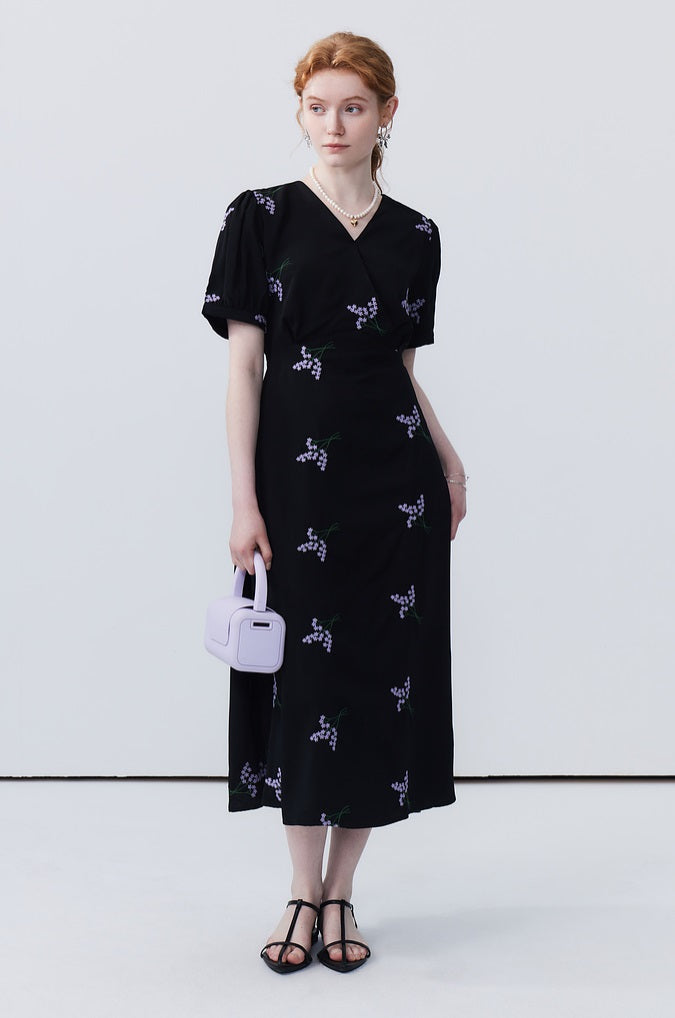 This dress showcases a stylish V-neck design that enhances the neckline with grace. Intricate embroidery adds a touch of charm and visual appeal, blending fashion with artistry. Designed for both elegance and comfort, it offers a perfect balance of sophistication and ease.