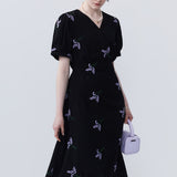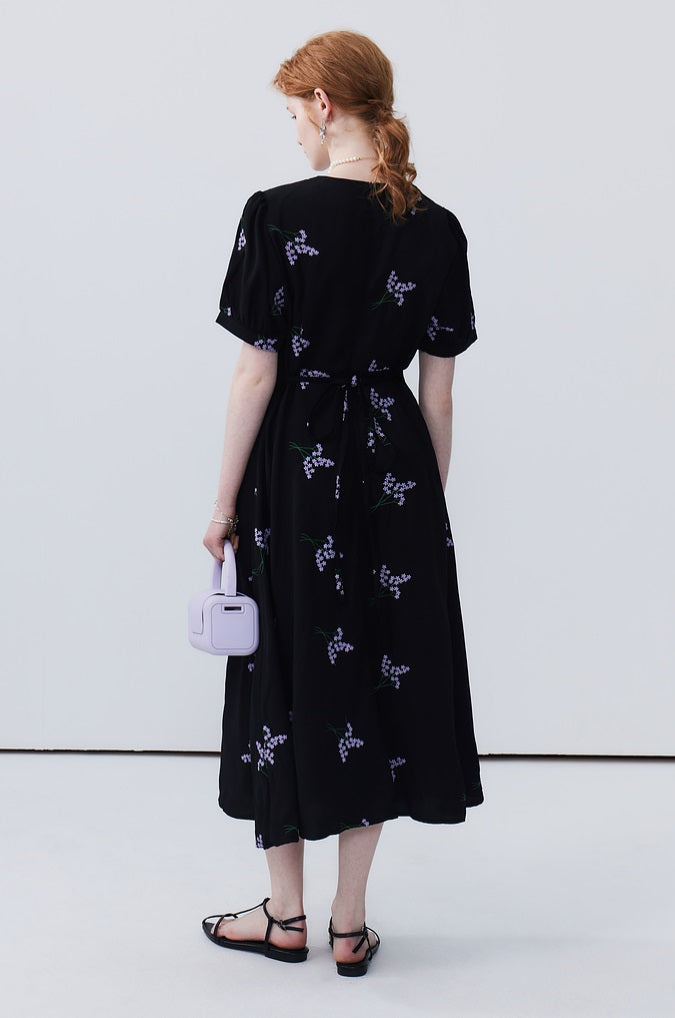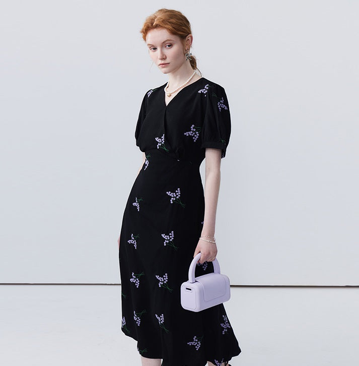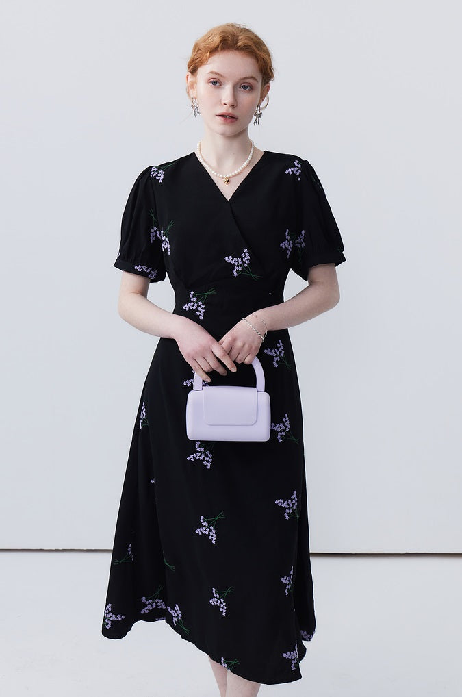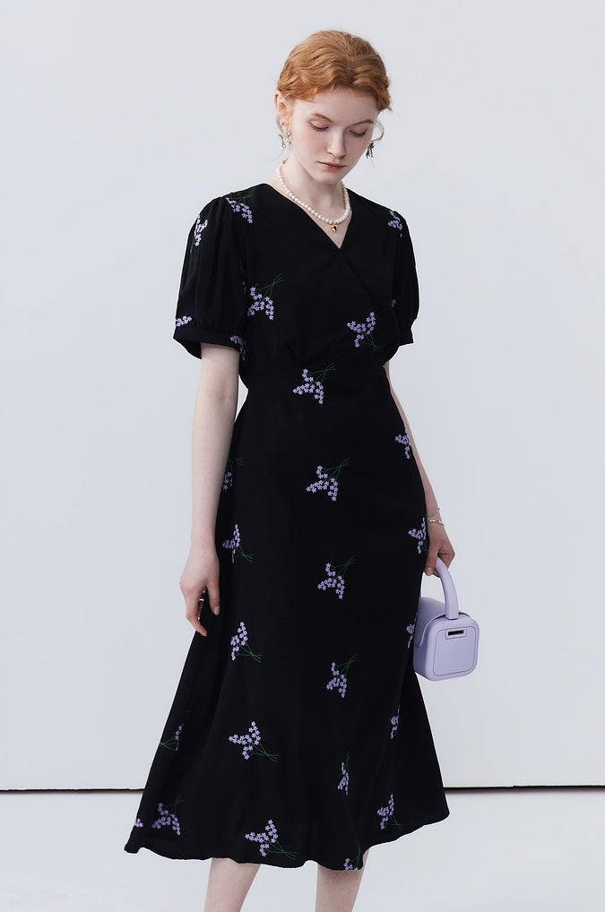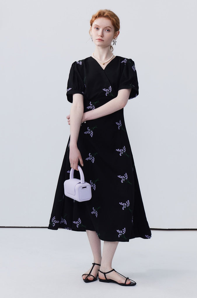 This dress showcases a stylish V-neck design that enhances the neckline with grace. Intricate embroidery adds a touch of charm and visual appeal, blending fashion with artistry. Designed for both elegance and comfort, it offers a perfect balance of sophistication and ease.