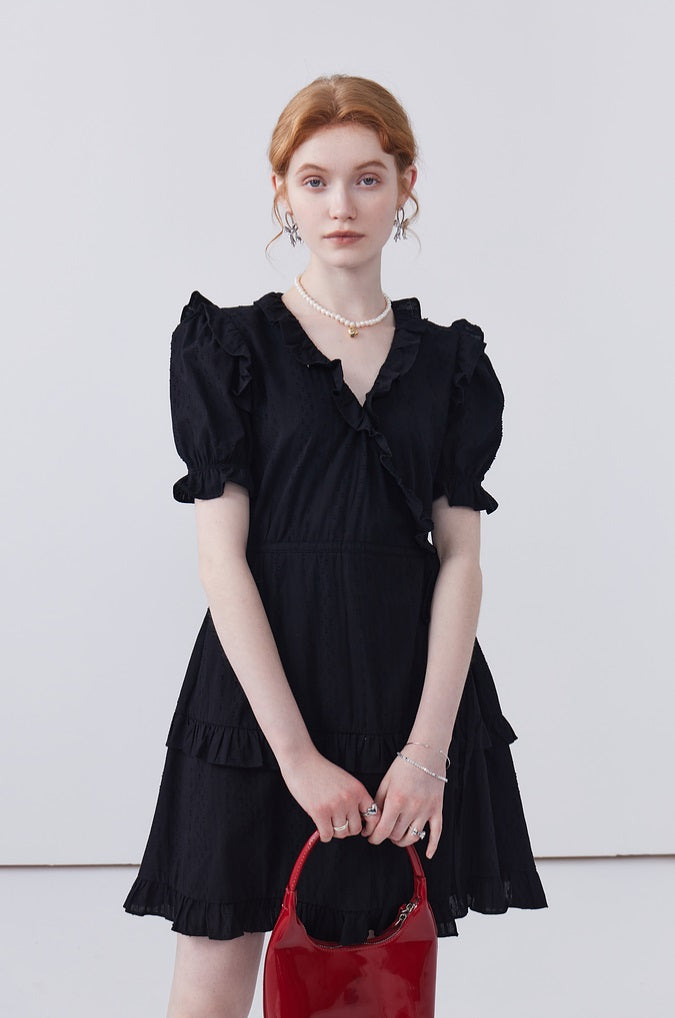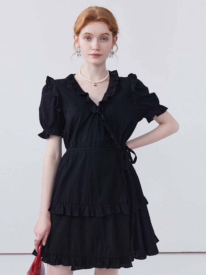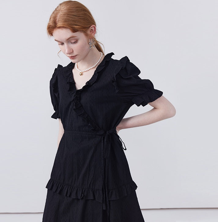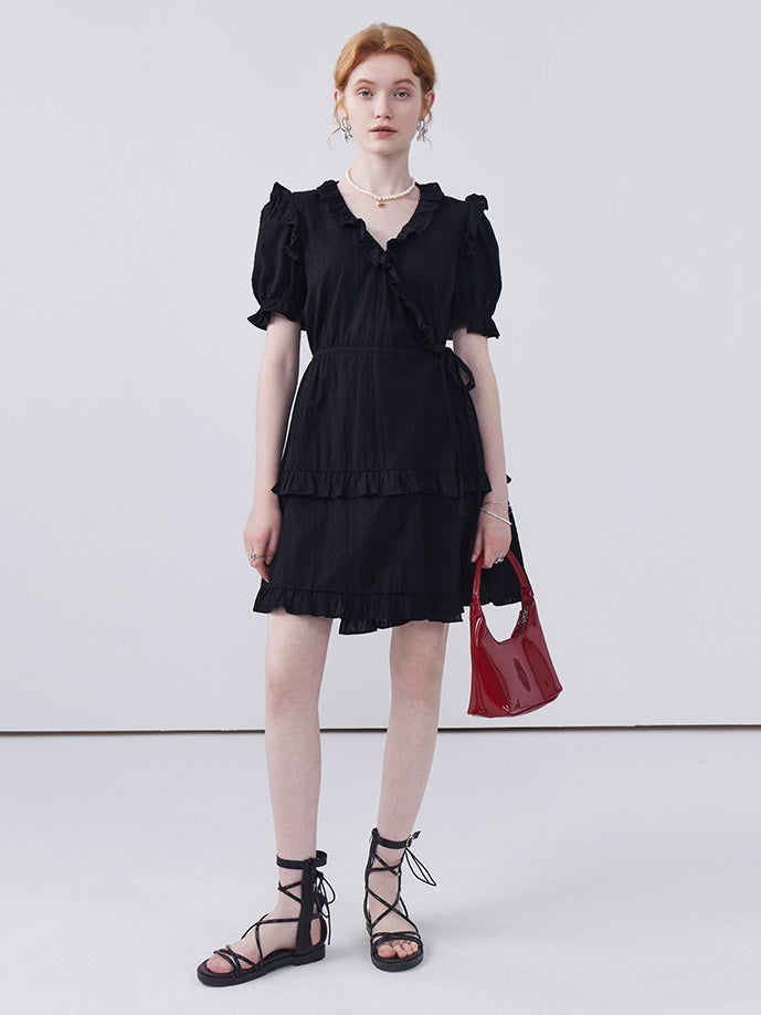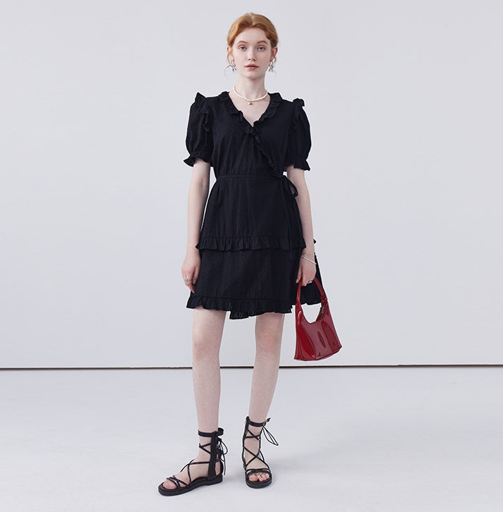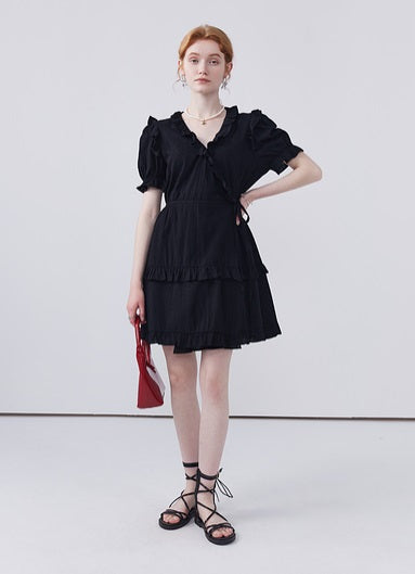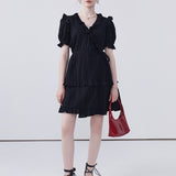 This dress features a fashionable V-neck adorned with delicate lace, adding a touch of elegance. The lace-up design enhances the silhouette, allowing you to adjust it for a figure-flattering fit.