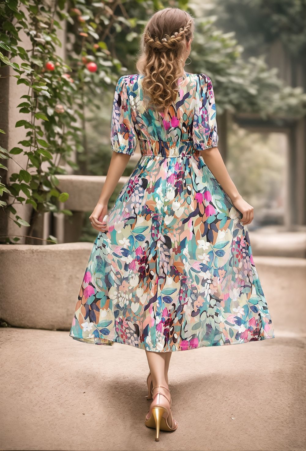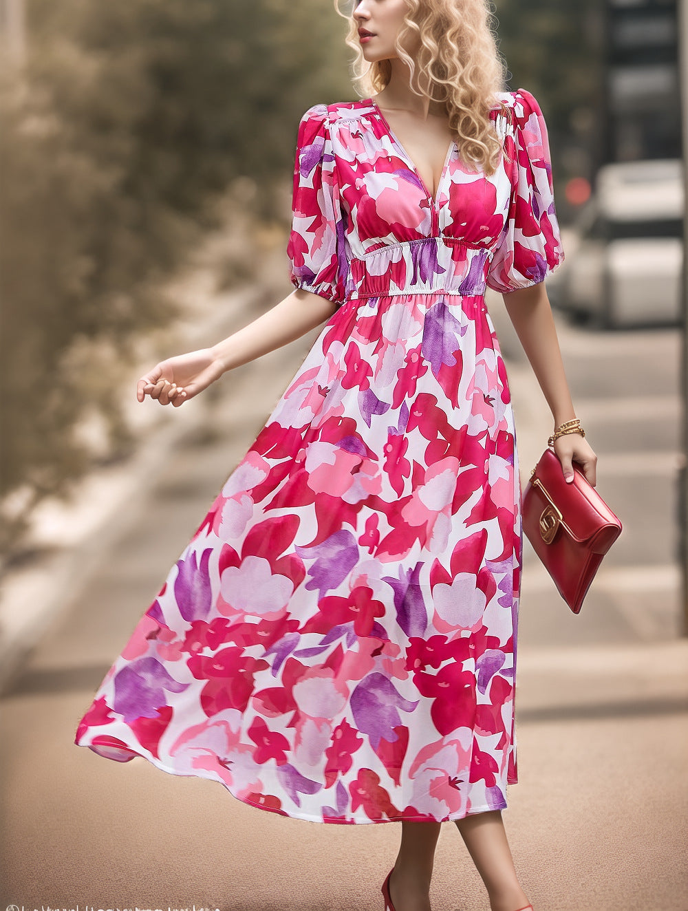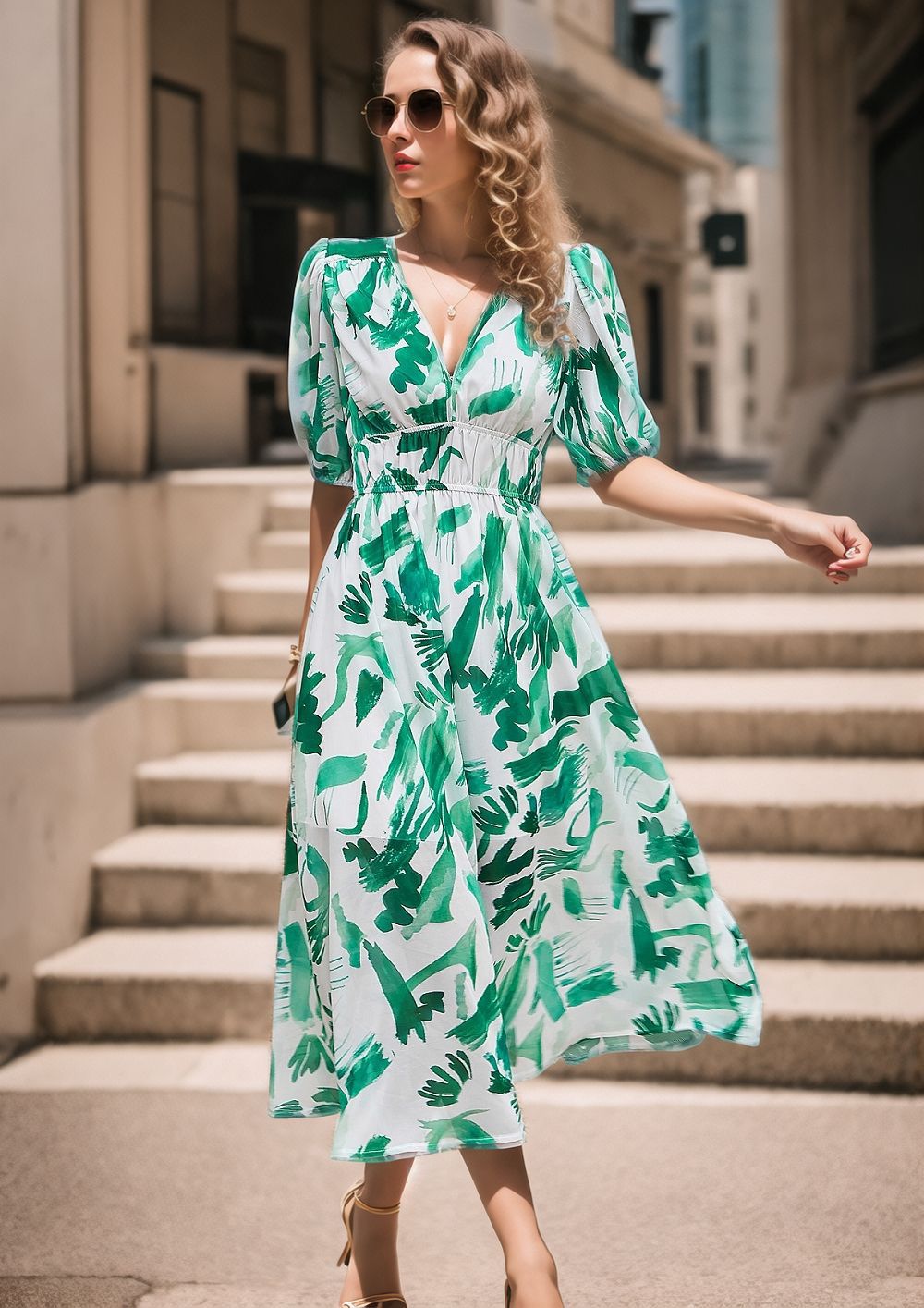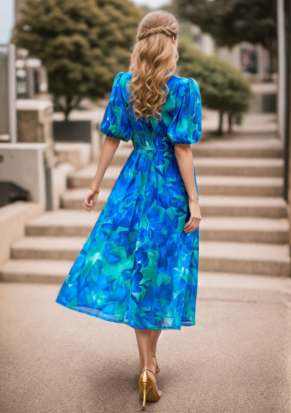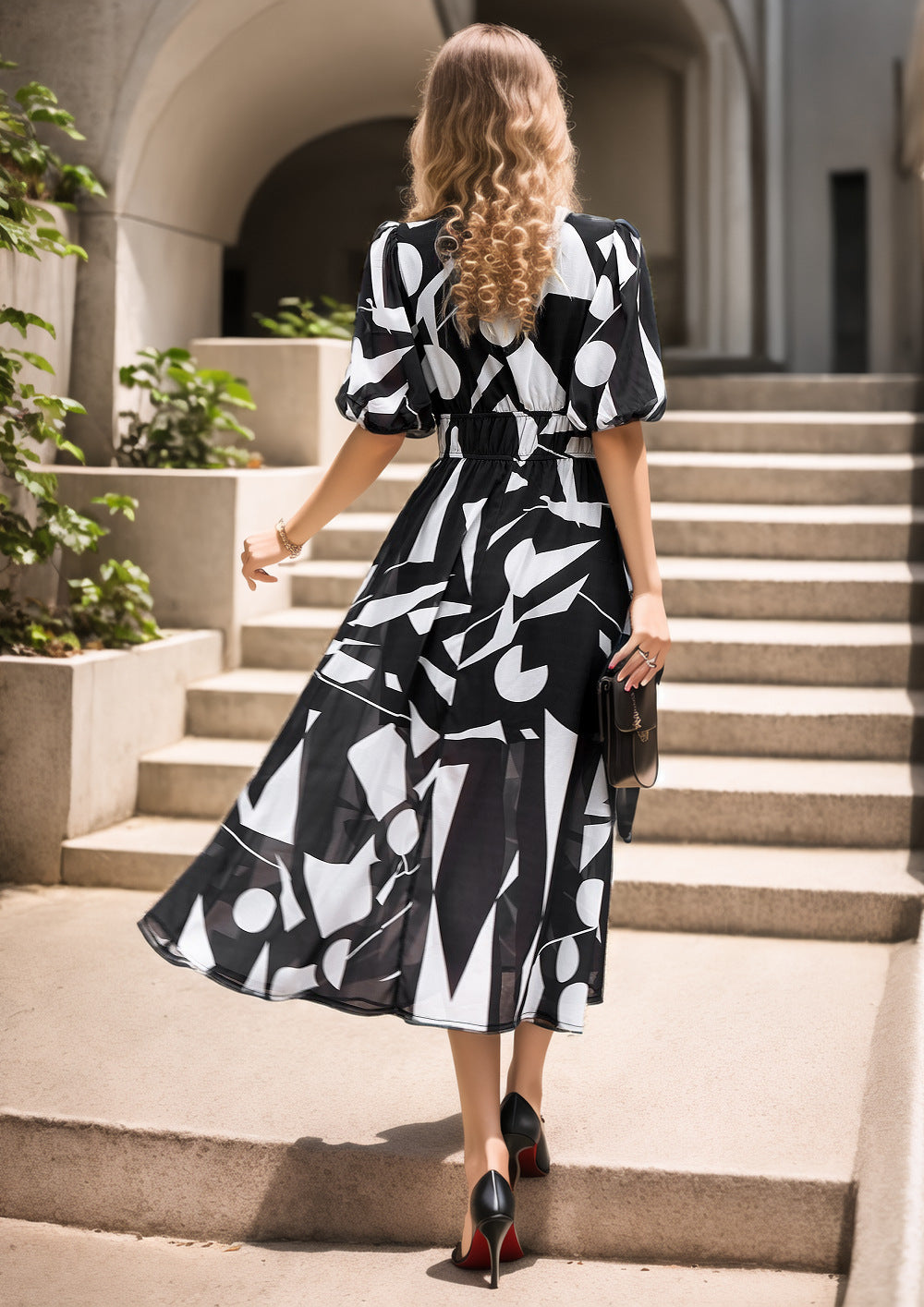 This maxi dress blends modern prints with an effortlessly chic silhouette. Designed with a flattering V-neckline and soft puff sleeves, it brings an elegant touch to everyday dressing. The cinched waistline enhances definition while offering a comfortable fit, and the flowing hemline creates graceful movement with every step. A versatile piece that transitions seamlessly from casual outings to more refined occasions.