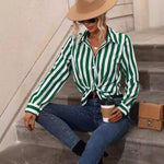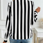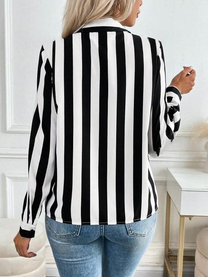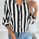 This button-up shirt features bold vertical stripes in a contrasting palette, creating a timeless yet modern look. Designed with a classic collar and long sleeves, it offers effortless sophistication for both casual outings and smart occasions. The vertical lines elongate the silhouette, while the relaxed fit ensures comfort throughout the day. Versatile and chic, it pairs seamlessly with jeans or tailored trousers for an elegant, confident style.