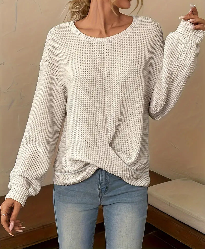 Embrace effortless comfort and style with this waffle-knit crew neck long-sleeve sweater, designed with a relaxed fit and trendy drop-shoulder silhouette. The soft waffle-knit texture not only adds warmth but also creates a chic, casual vibe. Perfect for layering or wearing on its own, this sweater is a versatile addition to your wardrobe for cool-weather outings or cozy days at home.