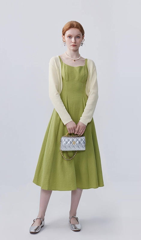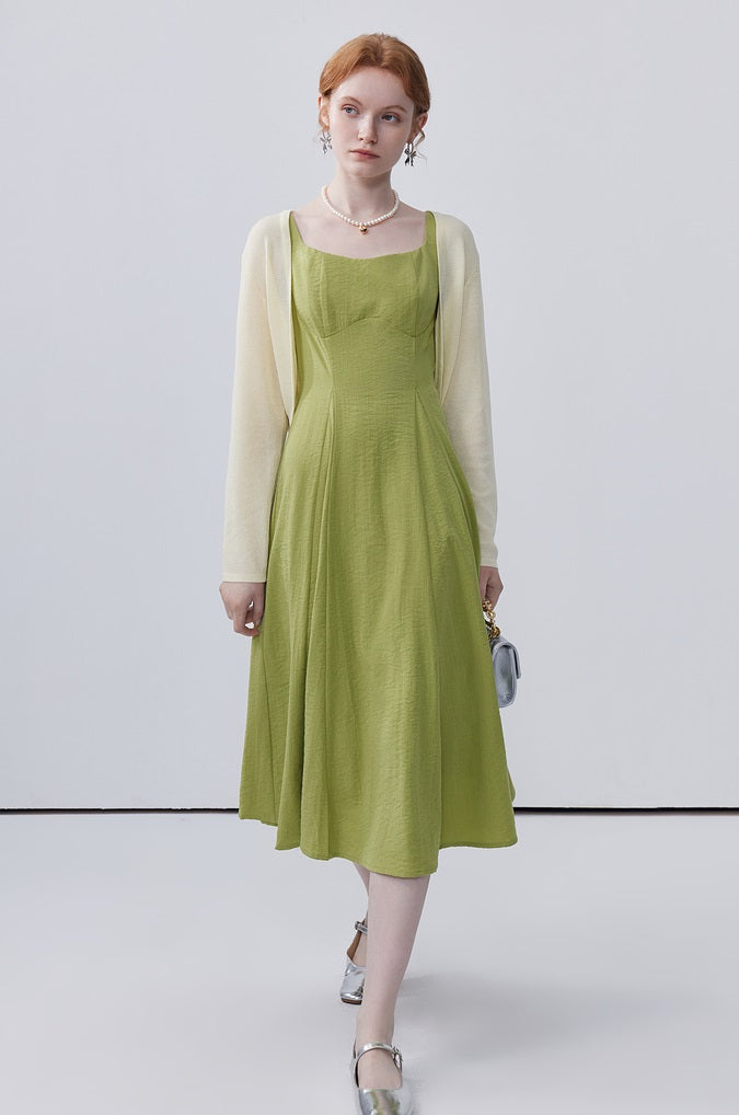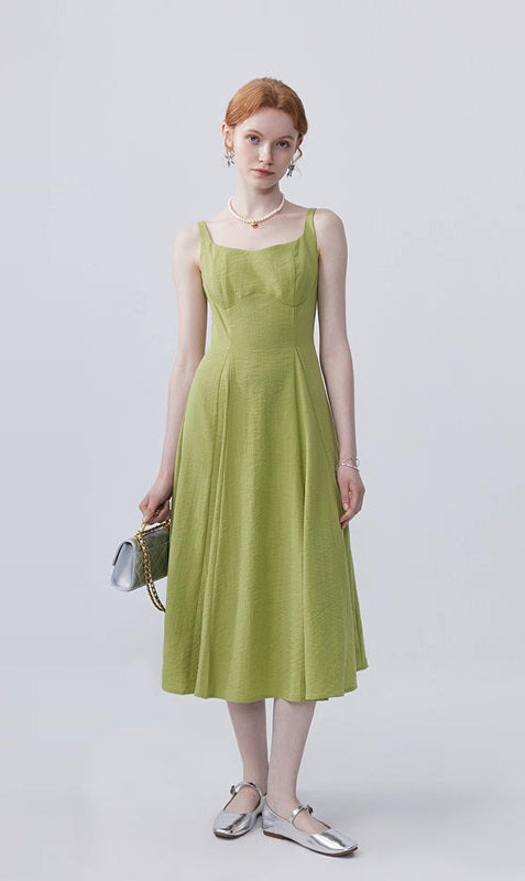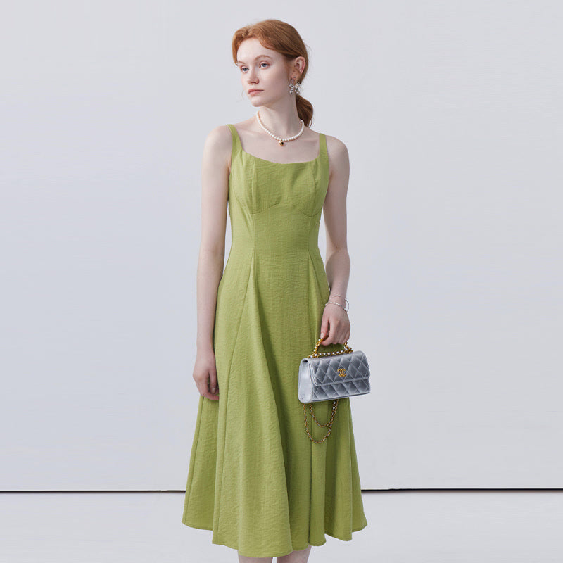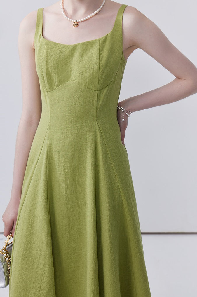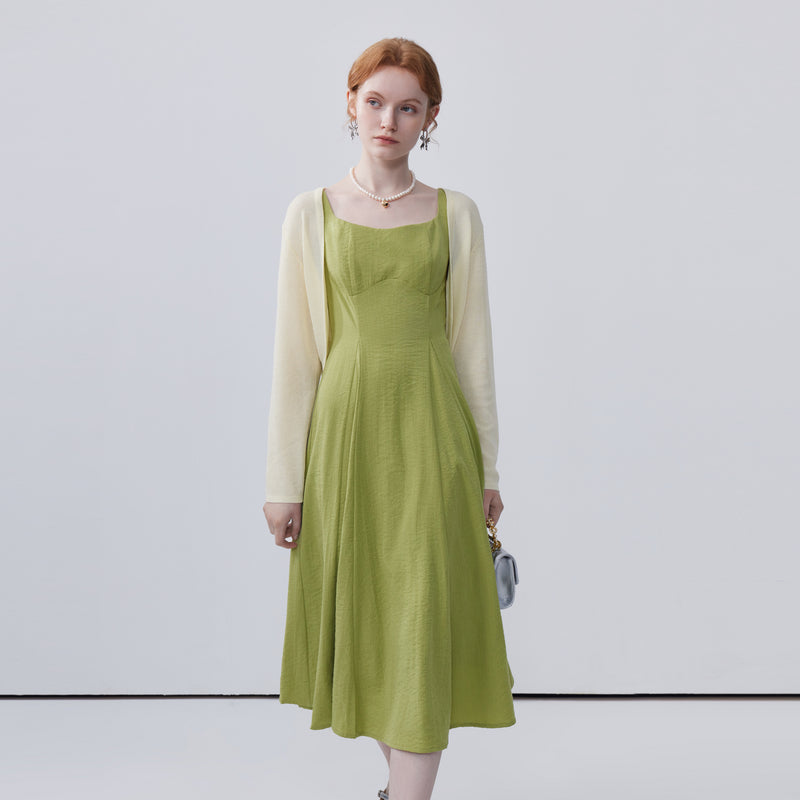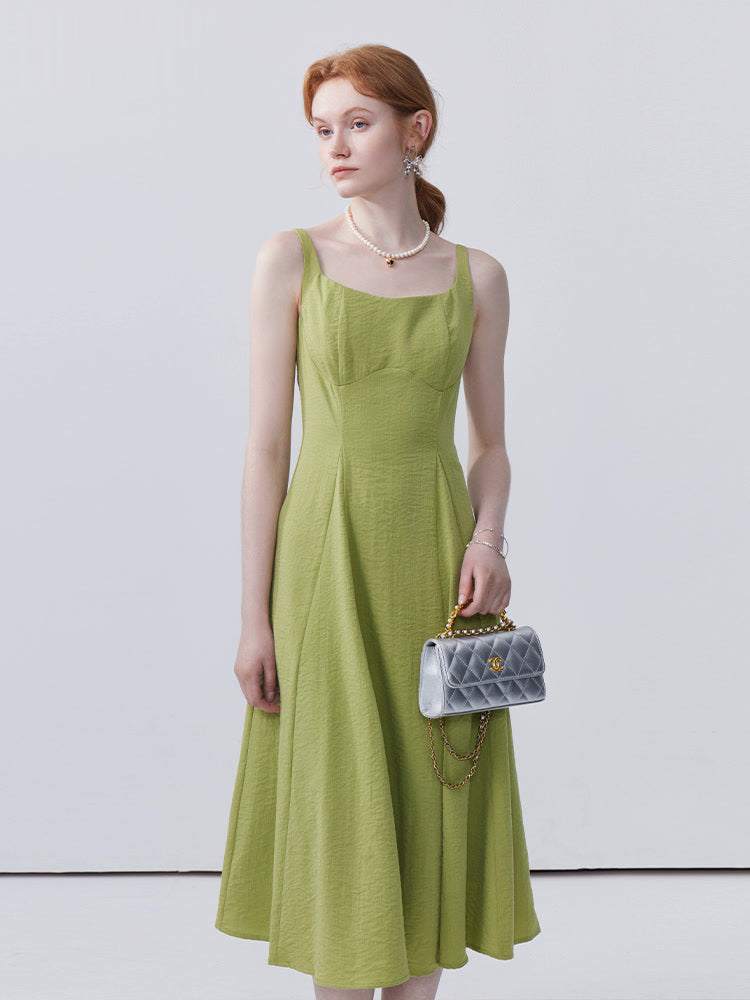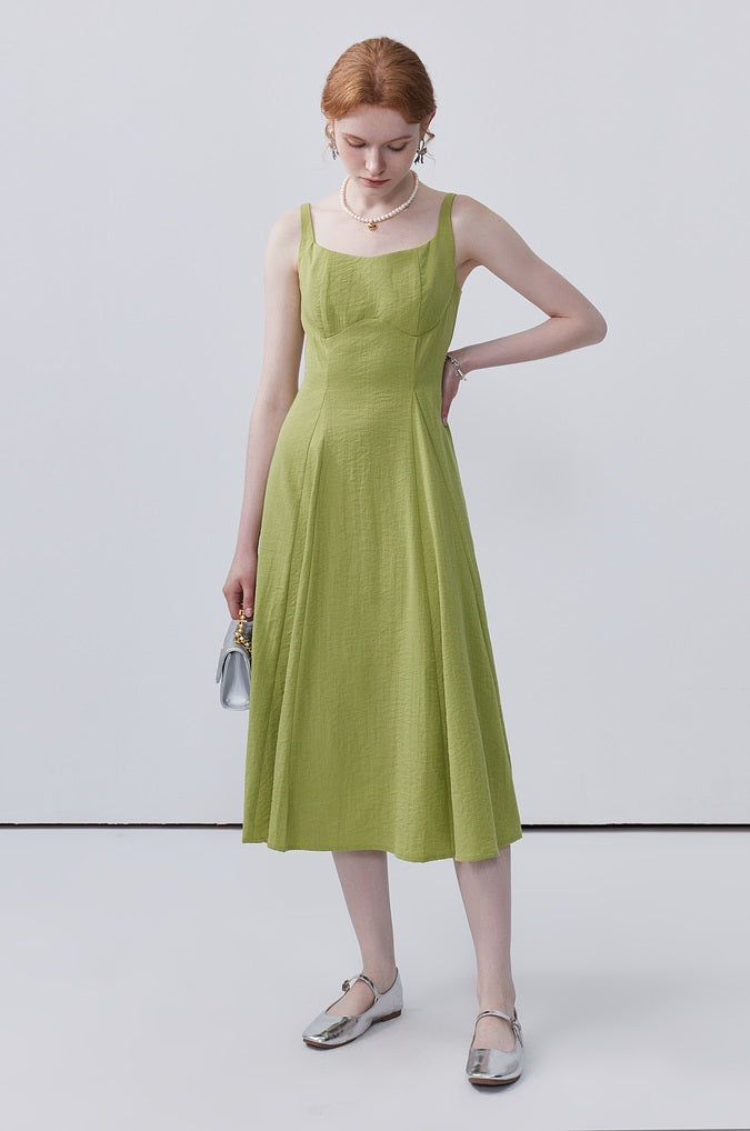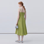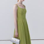 This dress features a refreshing square collar that elegantly showcases the clavicle line. The pleated design cinches the waist, adding depth and creating a flattering layered effect for a stylish and sophisticated look.