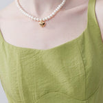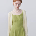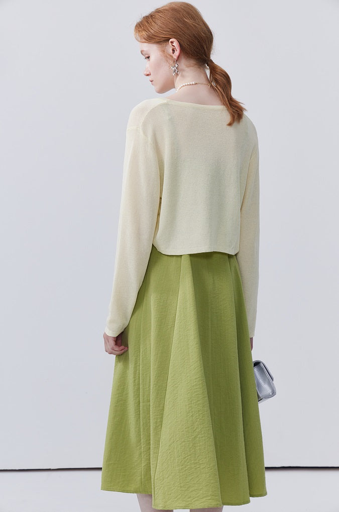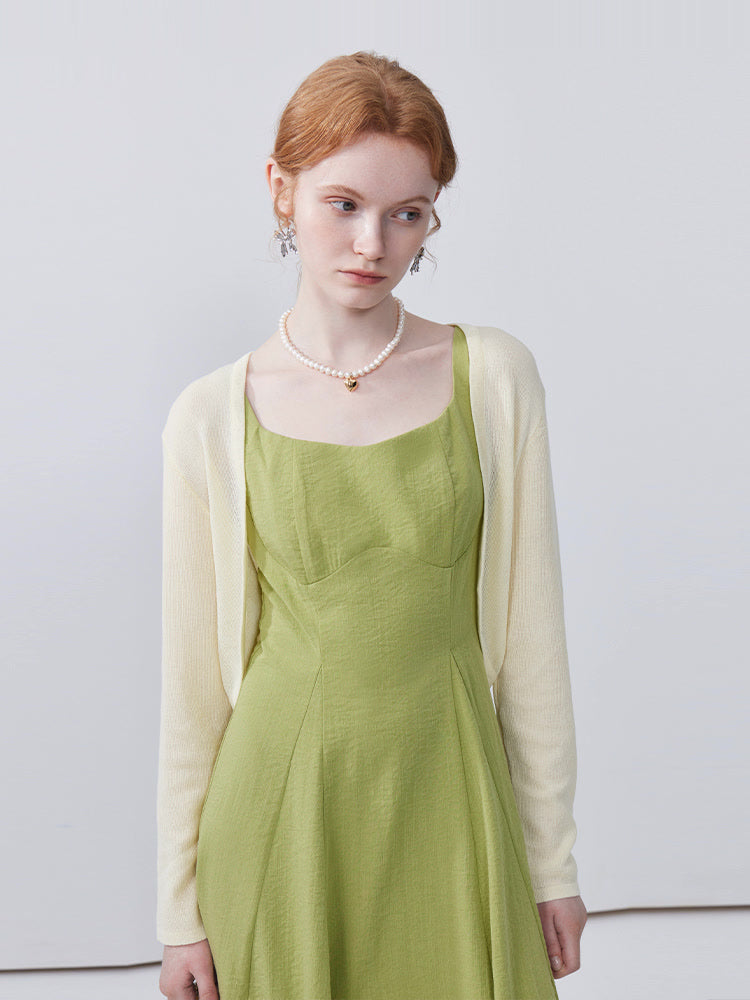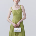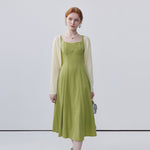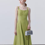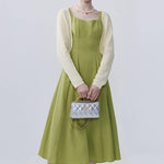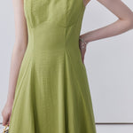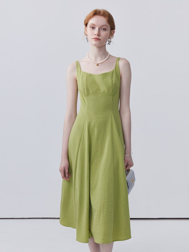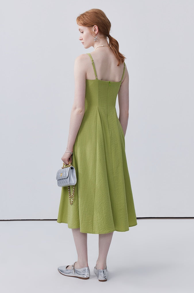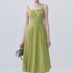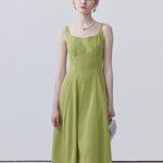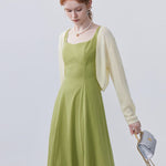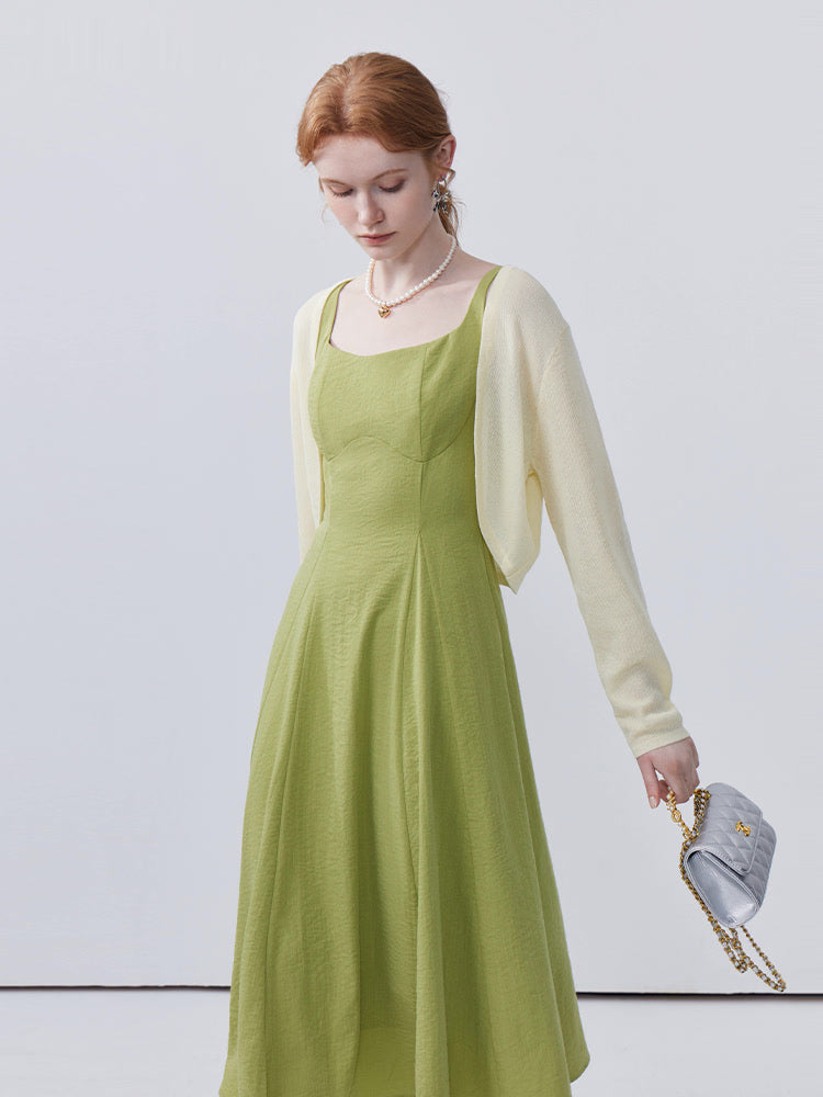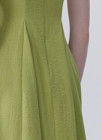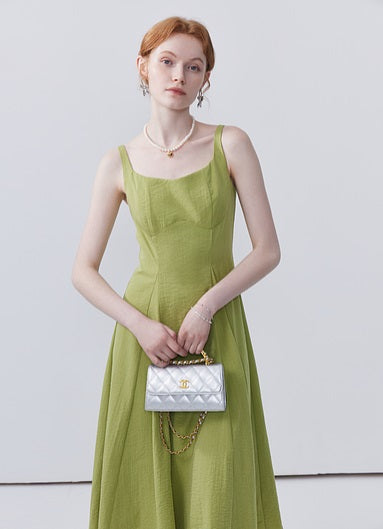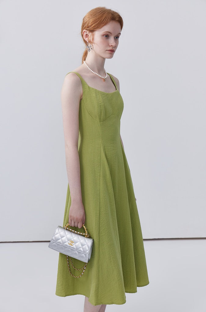 This dress features a refreshing square collar that elegantly showcases the clavicle line. The pleated design cinches the waist, adding depth and creating a flattering layered effect for a stylish and sophisticated look.