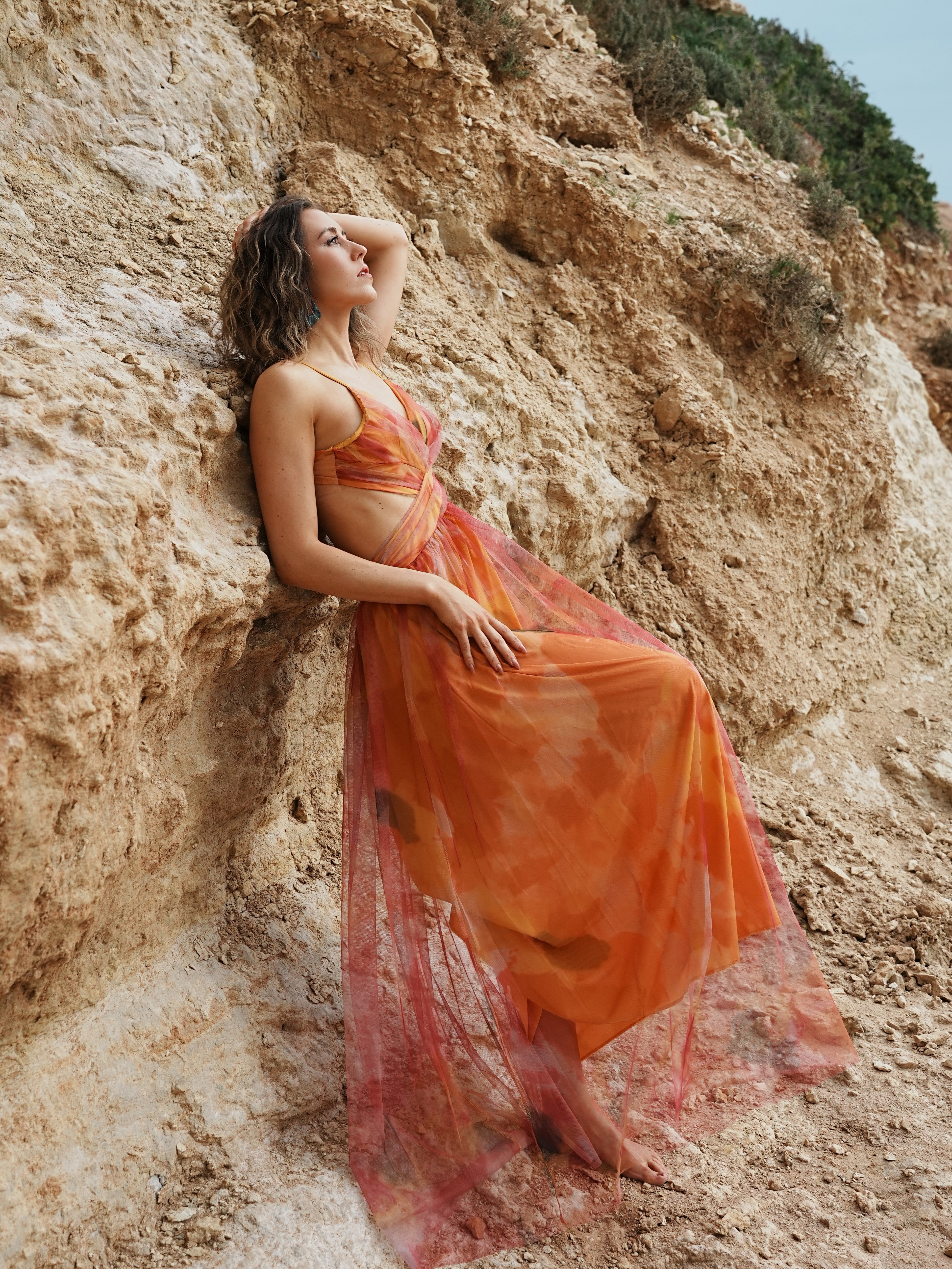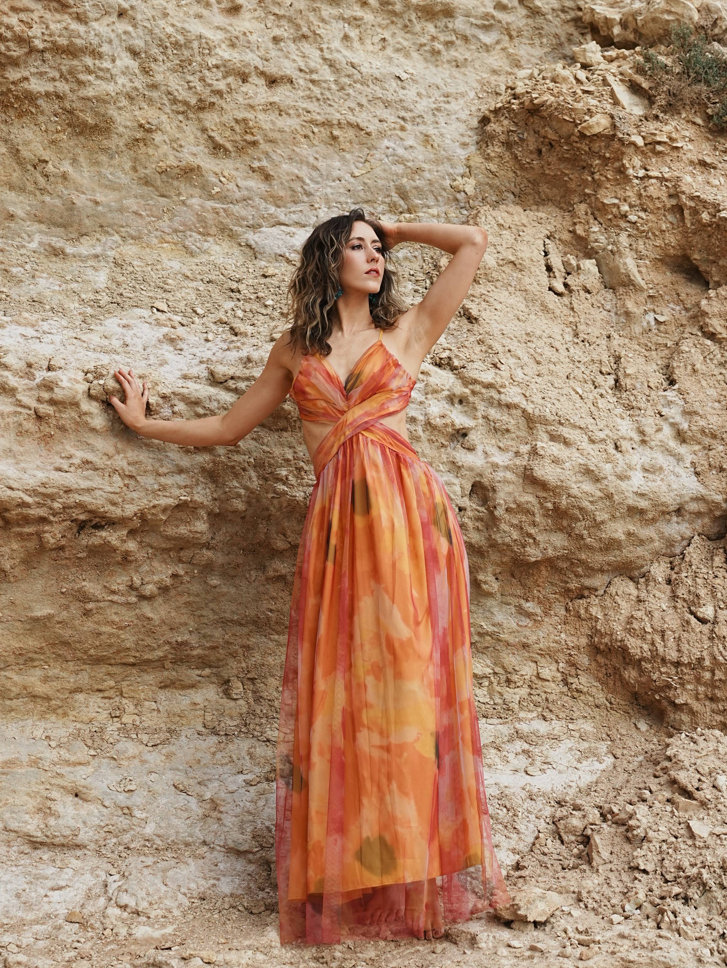 Step into elegance with this watercolor-inspired tulle gown. Featuring a flattering twisted bodice, adjustable back tie, and flowy floor-length silhouette, it’s made for summer weddings, romantic dinners, and every graceful moment in between.